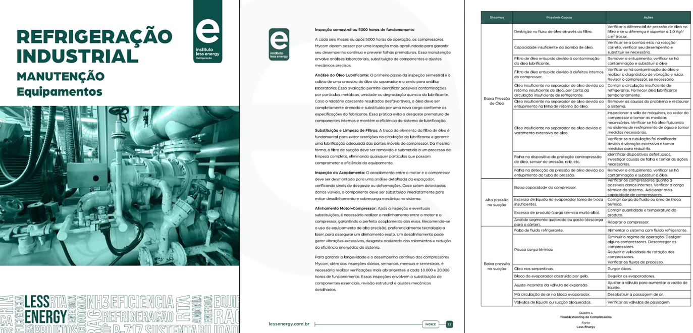 Ementa: • Manutenção em compressores e evaporadores • Manutenção em condensadores e bombas • Manutenção em vasos de pressão • Manutenção em quadro de válvulas • Manutenção em torres de resfriamento • Soldagem e manutenção em tubulações • Tabelas de troubleshooting de equipamentos • Normas de segurança na manutenção • Manutenção em ambientes de refrigeração
